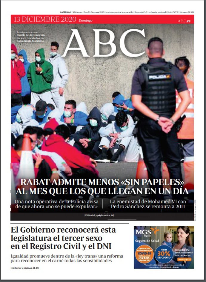 ABC: "Rabat admite menos 'sin papeles' al mes que los que llegan en un día"; "El Gobierno reconocerá esta legislatura el tercer sexo en el Registro Civil y el DNI".