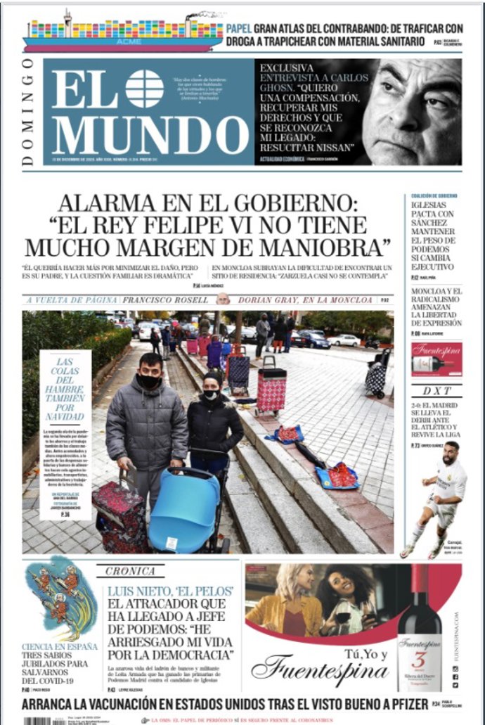 EL MUNDO: "Alarma en el Gobierno: 'El Rey Felipe VI no tiene mucho margen de maniobra"; "Las colas del hambre también por Navidad"; "Luis Nieto 'El Pelos'. El atracador que ha llegado a jefe de Podemos: 'He arriesgado mi vida por la democracia".