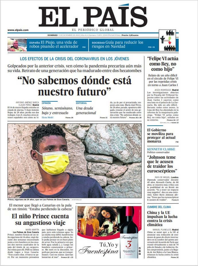 EL PAÍS: "Los efectos de la crisis del coronavirus en los jóvenes: 'No sabemos dónde está nuestro futuro'"; "Felipe VI actúa como Rey, no como hijo"; "El Gobierno se moviliza para proteger al actual monarca".