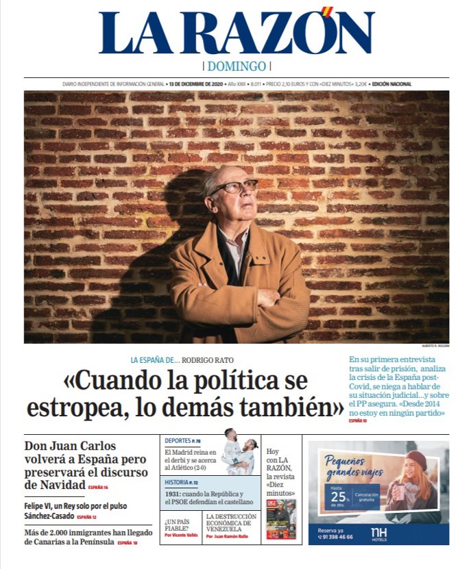 LA RAZÓN: "Rodrigo Rato: 'Cuando la política se estropea, lo demás también'"; "Don Juan Carlos volverá a España pero preservará el discurso de Navidad"; "Felipe VI, un Rey solo por el pulso Sánchez-Casado"; "Más de 2.000 inmigrantes han llegado de Canarias a la Península".
