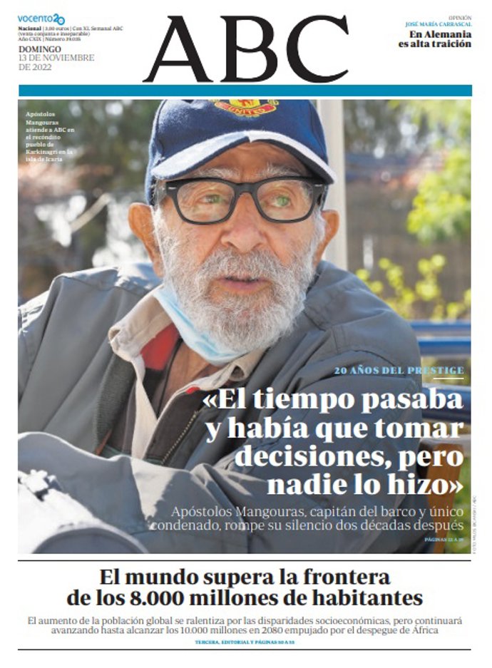 ABC: "20 años del Prestige. Apóstoles Mangouras, capitán del barco y único condenado, rompe su silencio décadas después: "El tiempo pasaba y había que tomar decisiones, pero nadie lo hizo""; "El mundo supera la frontera de los 8.000 millones de habitantes".