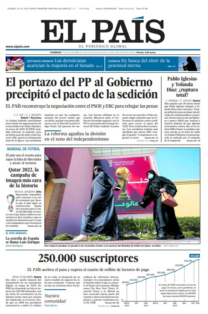 EL PAÍS: "El portazo del PP al Gobierno precipitó el pacto de la sedición"; "Pablo Iglesias y Yolanda Díaz: ¿ruptura total?"; "Qatar 2022, la campaña de imagen más cara de la historia. El país usa el evento para tapar la falta de libertades y atraer el turismo".