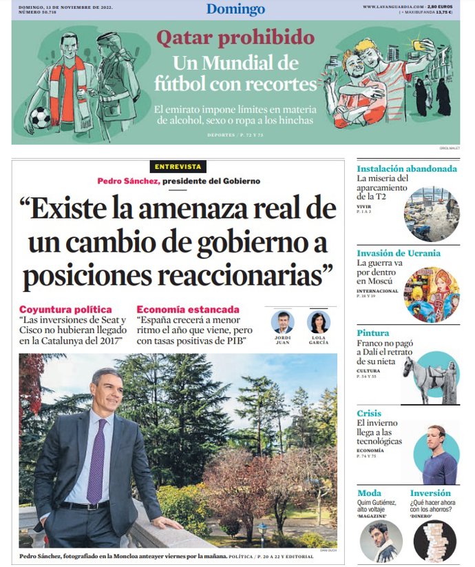 LA VANGUARDIA: "El presidente del Gobierno, Pedro Sánchez: "Existe la amenaza real de un cambio de gobierno a posiciones reaccionarias""; "Qatar prohibido. Un Mundial de fútbol con recortes".
