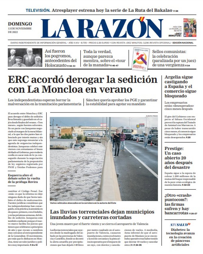 LA RAZÓN: "ERC acordó derogar la sedición con La Moncloa en verano"; "Argelia sigue castigando a España y el comercio sigue bloqueado"; "Prestige: Un caso abierto 20 años después del desastre"; "Las lluvias torrenciales dejan municipios inundados y carreteras cortadas"; "¿Otro "crash" puntocom?: las firmas sufren y hay bancarrotas".