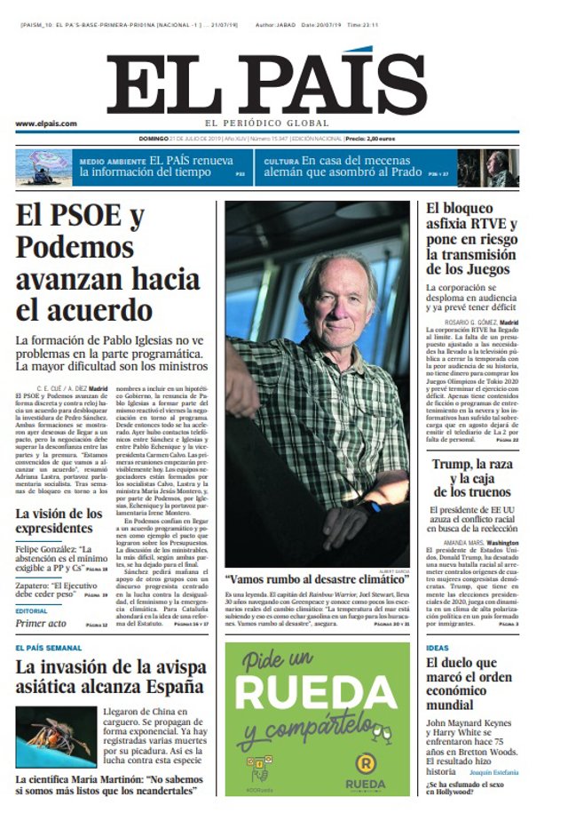 EL PAÍS: 'El PSOE y Podemos avanza hacia el acuerdo'; 'El bloque asfixia RTVE y pone en riesgo la transmisión de los Juegos'; 'Trump, la raza y la caja de los truenos'; 'La invasión de la avispa asiática alcanza España'; 'El duelo que marcó el orden económico mundial'.