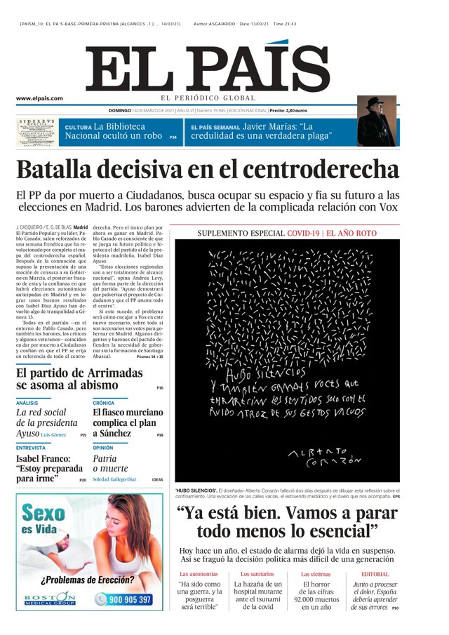 EL PAÍS: "La Biblioteca Nacional ocultó un robo"; "Javier Marías: "La credulidad es una verdadera plaga"; "Batalla decisiva en el centroderecha"; "El partido de Arrimadas se asoma al abismo"; "La red social de la presidenta Ayuso"; "El fiasco murciano complica el plan a Sánchez"; "Isabel Franco: "Estoy preparada para irme""; "Patria o muerte"; ""Ya está bien. Vamos a parar todo menos lo esencial""; "Las autonomías: "Ha sido como una guerra, y la posguerra será terrible""; "La hazaña de un hospital mutante ante el tsunami de la covid"; "El horror de las cifras: 92.000 muertos en un año"; "Junto a procesar el dolor, España debería aprender de sus errores".
