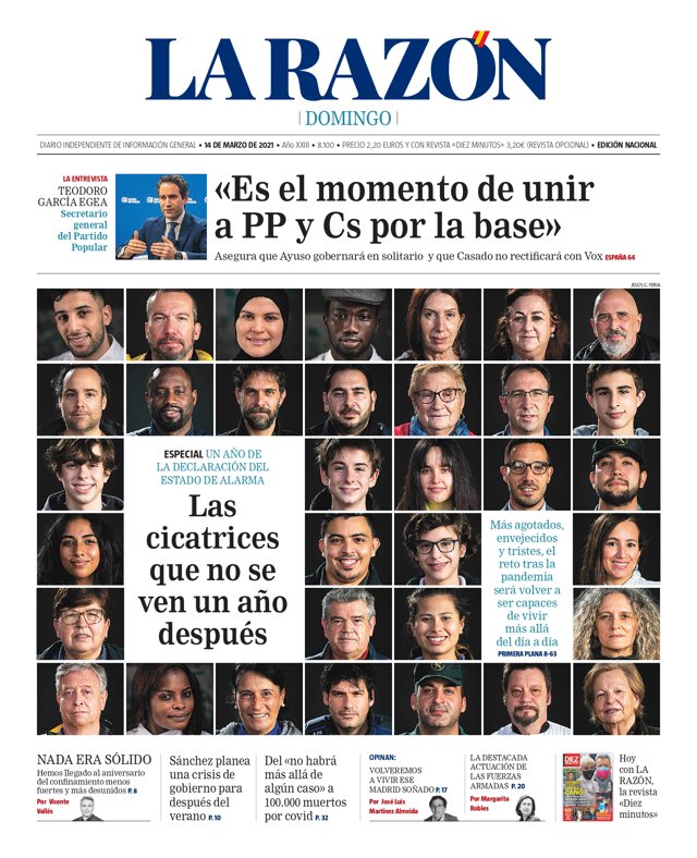 LA RAZÓN: "Las cicatrices que no se ven un año después"; "Más agotados, envejecidos y tristes, el reto tras la pandemia será volver a ser capaces de vivir más allá del día a día"; "Teodoro García Eega: "Es el momento de unir a PP y Cs por la base""; "Nada era sólido"; "Sánchez planea una crisis de gobierno para después del verano"; "Del "no habrá más allá de algún caso" a 100.000 muertos por covid"; "Volveremos a vivir ese Madrid soñado"; "La destacada actuación de las Fuerzas Armadas".