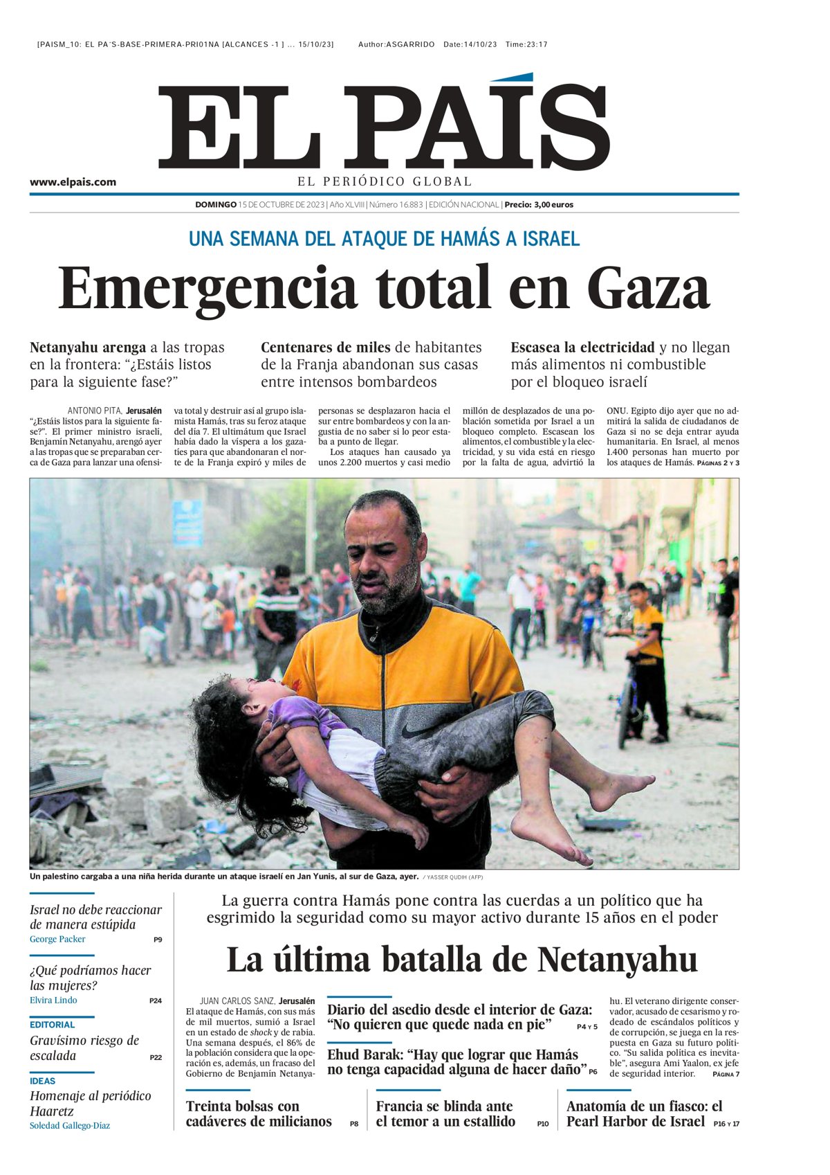 EL PAÍS: "Una semana del Ataque de Hamás a Israel. Emergencia total en Gaza"; "La última batalla de Netanyahu"; "Diario del asedio desde el interior de Gaza: "No quieren que quede nada en pie""; "Ethud Barak: "Hay que lograr que Hammás no tenga capacidad alguna de hacer daño""; "Treinta bolsas con cadáveres de milicianos"; "Francia se blinda ante el temor a un estallido"; "Anatomía de un fiasco: el Pearl Harbor de Israel".