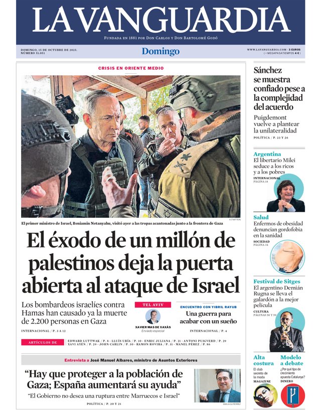 LA VANGUARDIA: "El éxodo de un millón de palestinos deja la puerta abierta al ataque de Israel"; "Sánchez se muestra confiado pese a la complejidad del acuerdo"; "El libertario Milei seduce a los ricos y a los pobres"; "El argentino Demián Rugna se lleva el galardón a la mejor película"; "El ministro de Asuntos Exteriores, José Manuel Albares: "Hay que proteger a la población de Gaza; España aumetará su ayuda"".