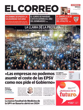 EL CORREO: "Las empresas no podemos asumir el coste de las EPSV como nos pide el Gobierno"; "La nueva Facultad de Medicina de la UPV en Basurto abrirá en 2024"; "Los chalecos amarillos, a menos. La tensión social se rebaja en Francia un mes después".