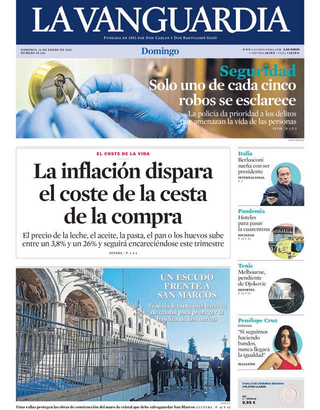 LA VANGUARDIA: "La inflación dispara el coste de la cesta de la compra"; "Solo una de cada cinco robos se esclarece"; "Venecia levant una barrera de cristal para proteger la basílica de las mareas"; "Berlusconi sueña con ser presidente"; "Hoteles para pasar la cuarentena"; "Melbourne, pendiente de Djokovic"; "Penélope Cruz: Si seguimos haciendo bandos, nunca llegará la igualdad".