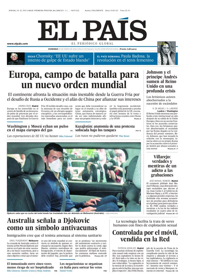 EL PAÍS: "Europa, campo de batalla para un nuevo orden mundial"; "Washington y Moscú echan un pulso en el mapa europeo del gas"; "Kazajistán: anatomía de una protesta sofocada bajo los tanques"; "Australia señala a Djokovic omo un símbolo antivacunas"; "Johnson y el príncipe Andrés sumen al Reino Unido en una profunda crisis"; "Villarejo: verdades y mentiras de un adicto a las grabaciones"; "Controlada por el móvil, vendida en la red".