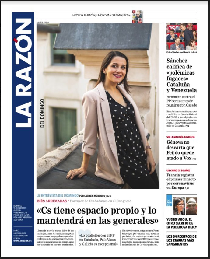 LA RAZÓN: "Inés Arrimadas: 'Cs tiene espacio propio y lo mantendrá en las generales"; "Sánchez califica de 'polémicas fugaces' Cataluña y Venezuela"; "Génova no descarta que Feijóo quede atado a Vox"; "Francia registra el primer muerto por coronavirus en Europa".