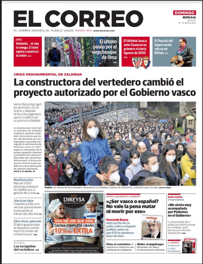EL CORREO: "La constructora del vertedero cambió el proyecto autorizado por el Gobierno vasco"; "Más de 5.000 personas protestan en Zaldibar por la gestión de la crisis"; "Osakidetza pide a los vecinos que extremen la precaución al menos dos días más"; "Nadia Calviño: 'Me siento muy acompañada por Podemos en el Gobierno'".