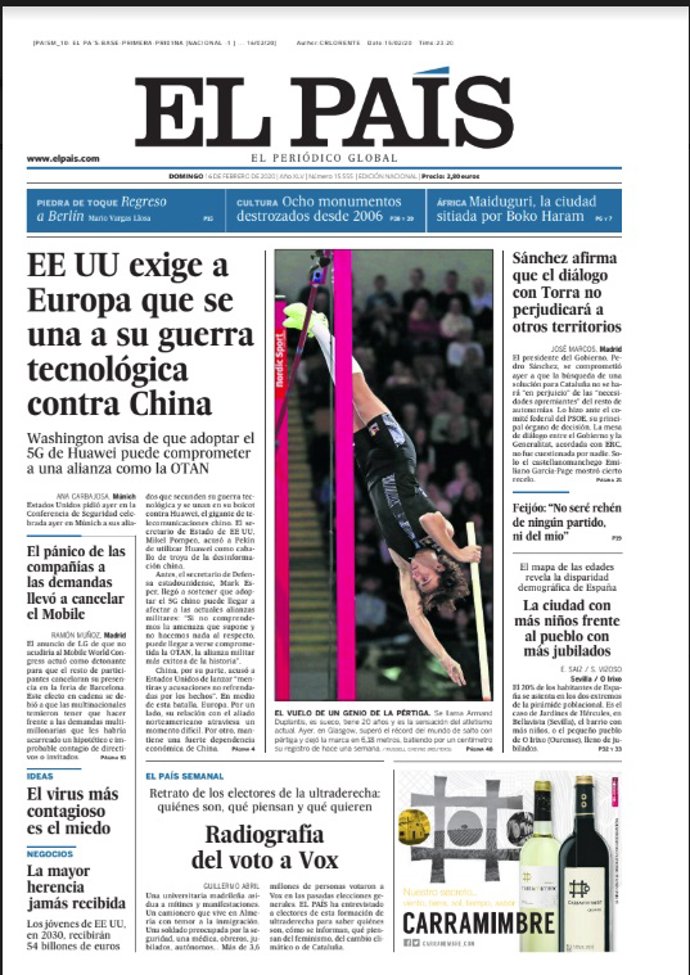 EL PAÍS: "EEUU exige a Europa que se una a su guerra tecnológica contra China"; "Sánchez afirma que el diálogo con Torra no perjudicará a otros territorios"; "El virus más contagioso es el miedo"; "La ciudad con más niños frente al pueblo con más jubilados"; "Feijóo: 'No seré rehén de ningún partido, ni del mío".