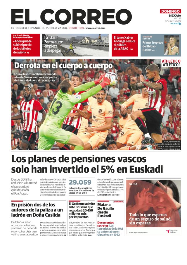 EL CORREO: "Derrota en el cuerpo a cuerpo"; "Los planes de pensiones vascos solo han invertido el 5% en Euskadi"; "En prisión dos de los autores de la paliza a un ladrón en Doña Casilda"; "El Gobierno admite ante Bruselas que recaudará más por impuestos"; "Matar a De Gaulle desde Euskadi".