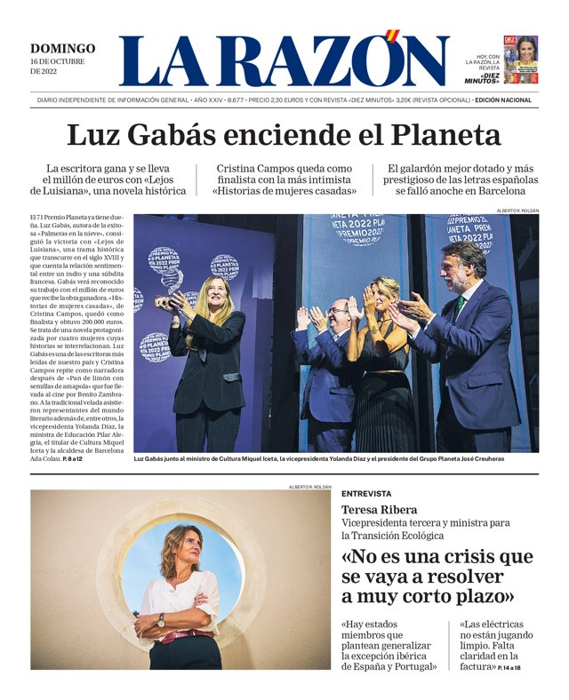 LA RAZÓN: "Luz Gabás enciende el Planeta"; "Teresa Ribera: No es una crisis que se vaya a resolver a muy corto plazo".