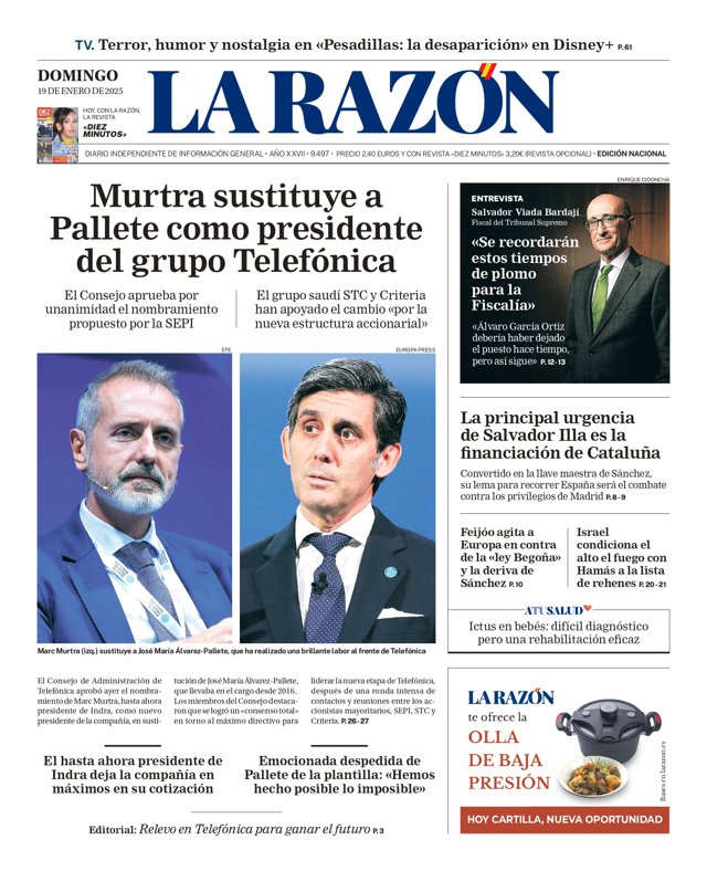LA RAZÓN: "Murtra sustituye a Pallete como presidente del grupo Telefónica"; "La principal urgencia de Salvador Illa es la financiación de Cataluña"; "Feijóo agita a Europa en contra de la 'ley Begoña' y la deriva de Sánchez"; "Israel condiciona el alto el fuego con Hamás a la lista de rehenes"; "Salvador Viada, fiscal del Tribunal Supremo: 'Se recordarán estos tiempos de plomo para la Fiscalía'".