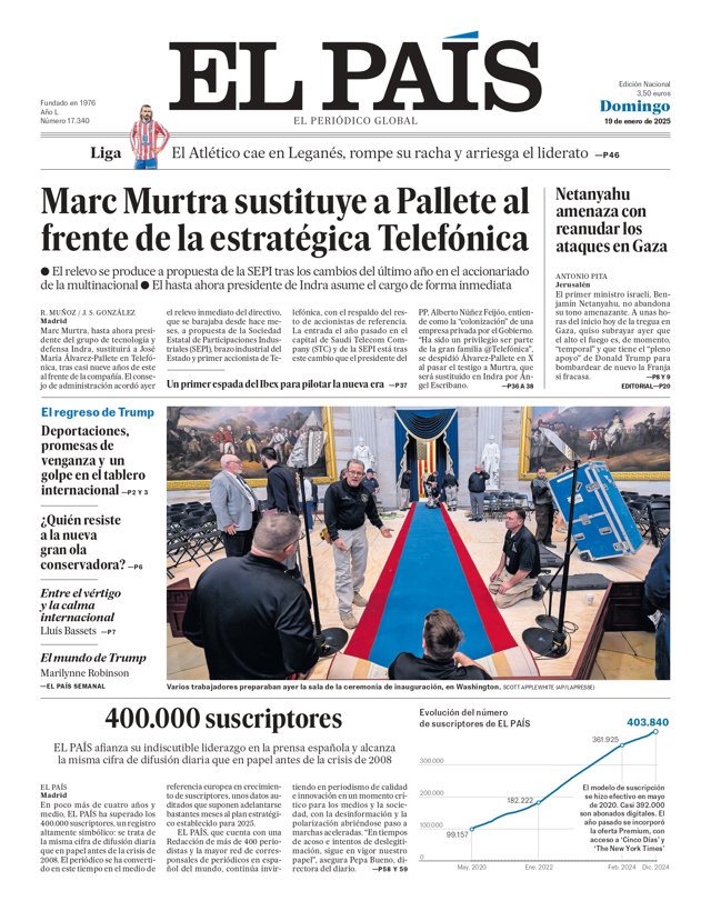 EL PAÍS: "Marc Murtra sustituye a Pallete al frente de la estratégica Telefónica"; "Netanyahu amenaza con reanudar los ataques en Gaza"; "El regreso de Trump: Deportaciones, promesas de venganza y un golpe en el tablero internacional"; "¿Quién resiste a la nueva gran ola conservadora?"; "400.000 suscriptores"; "El Atlético cae en Leganés, rompe su racha y arriesga el liderato".