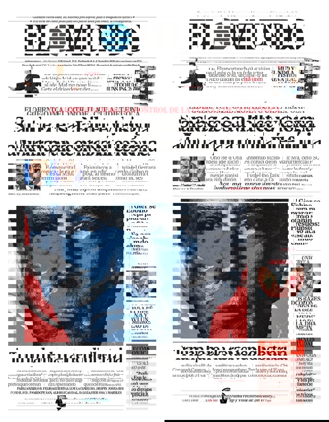 EL MUNDO: "El Gobierno toma el control de la cúpula de Telefónica: Sánchez cesa a Pallete y designa a Murtra para controlar Telefónica"; "Trump abre la era tecnolibertaria"; "El Gobierno se prepara para otro año sin Presupuestos: 'No se acaba el mundo'"; "Dos corazones para la bebé Navia y un milagro de la medicina"; "El Leganés corta la racha (1-0) de 15 victorias del Atlético de Madrid, el Barça empata (1-1) frente al Getafe y el Madrid puede ponerse líder".
