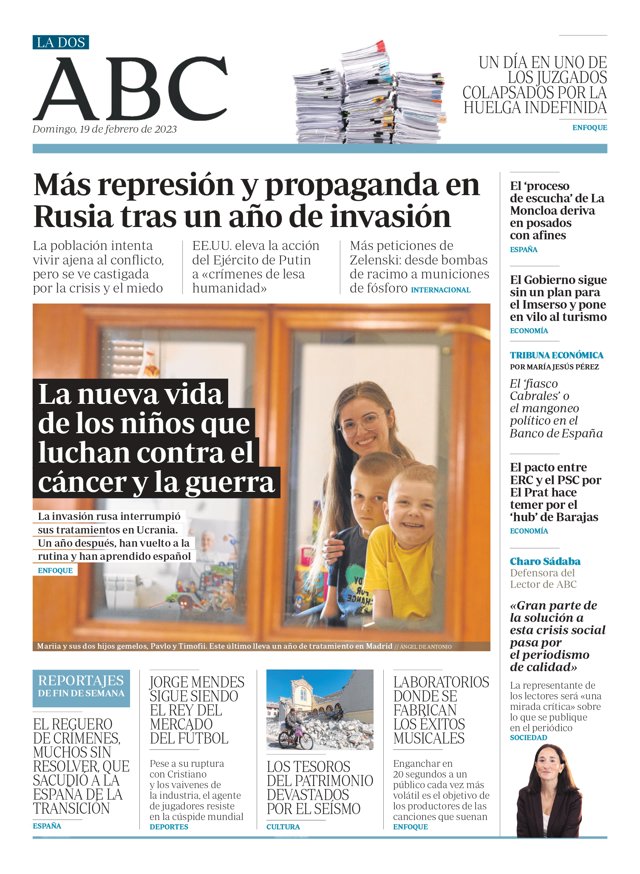 ABC: "Más represión y propaganda en Rusia tras un año de invasión"; La nueva vida de los niños que luchan contra el cáncer y la guerra"; "El 'proceso de escucha' de La Moncloa deriva en posados con afines".