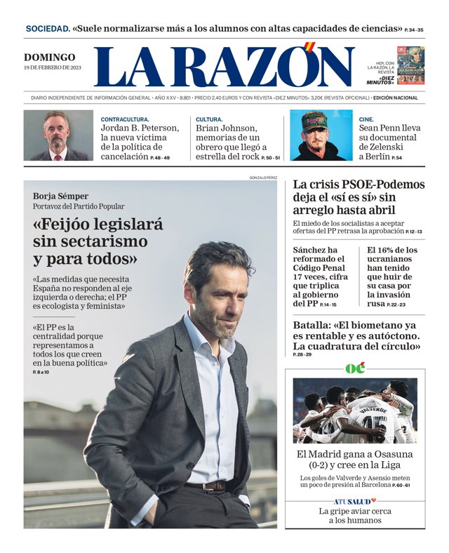LA RAZÓN: "Sémper: Feijóo legislará sin sectarismo y para todos"; "La crisis PSOE-Podemos deja el sí es sí sin arreglo hasta abril"; "El 16% de los ucranianos han tenido que huir de su casa por la invasión rusa".