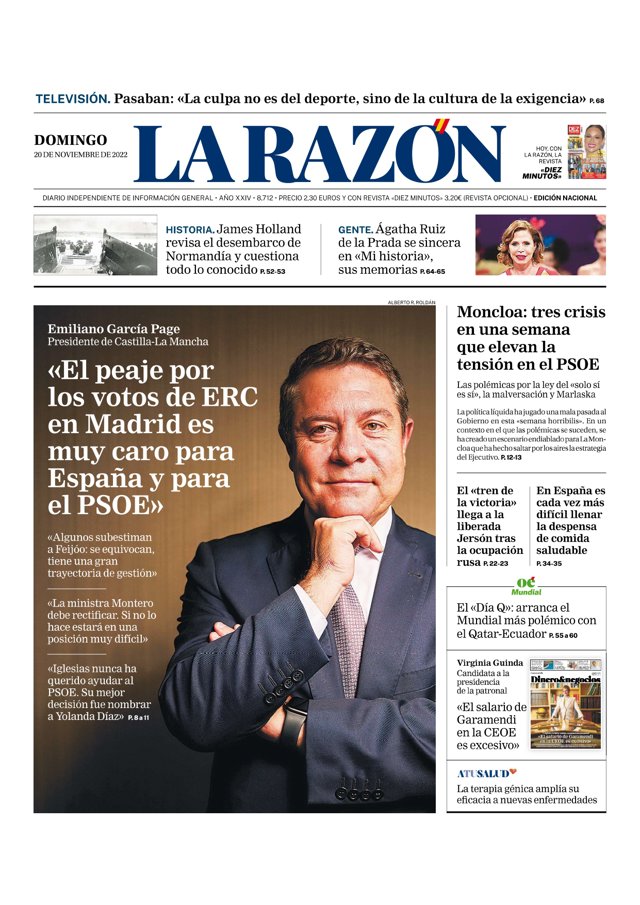 LA RAZÓN: "García Page: El peaje por los votos de ERC en Madrid es muy caro para España y para el PSOE"; "Moncloa: tres crisis en una semana que elevan la tensión en el PSOE".