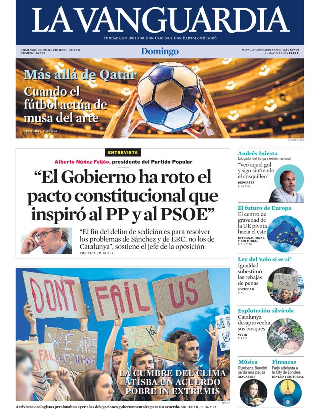 LA VANGUARDIA: "Feijóo: El Gobierno ha roto el pacto constitucional que inspiró al PP y al PSOE"; "La Cumbre del Clima atisba un acuerdo pobre in extremis"; "Más allá de Qatar".