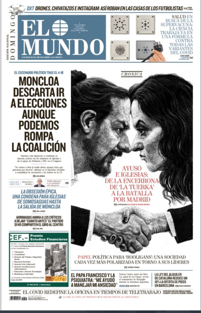 EL MUNDO: "Moncloa descarta ir a elecciones aunque Podamos rompa la coalición"; "Ayuso e Iglesias: de la encerrona de 'La Tuerka' a la batalla por Madrid".