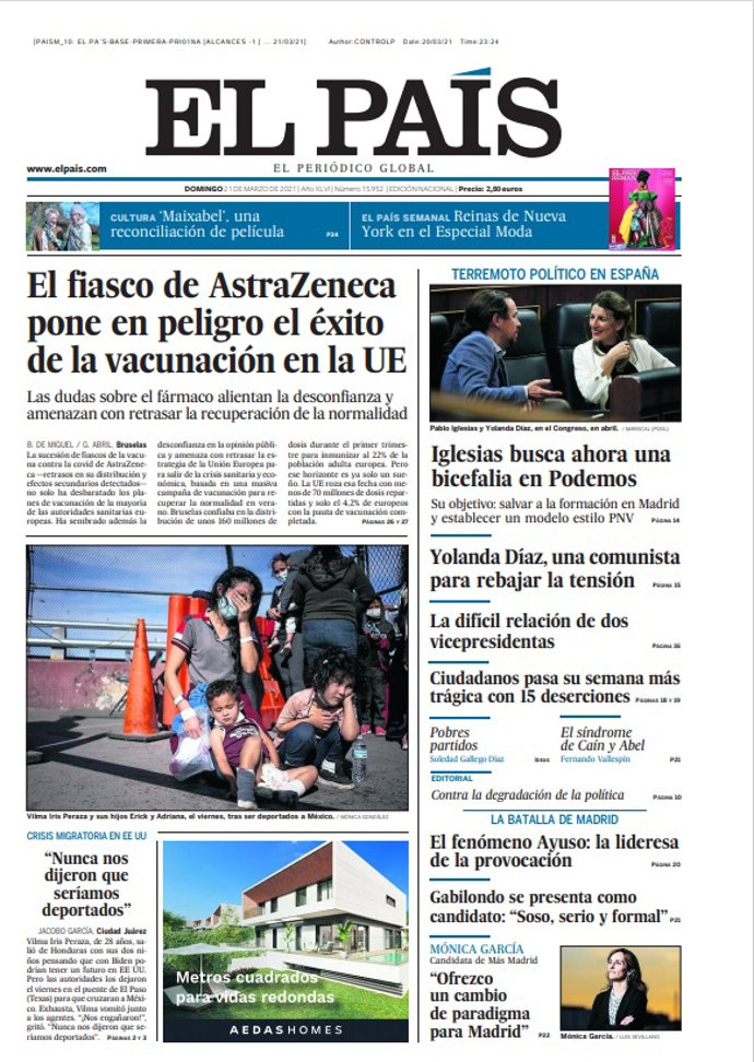 EL PAÍS: "El fiasco de AstraZeneca pone en peligro el éxito de la vacunación en la UE"; "Iglesias busca ahora una bicefalia en Podemos"; "Yolanda Díaz, una comunista para rebajar la tensión"; "Ciudadanos pasa su semana más trágica con 15 deserciones".