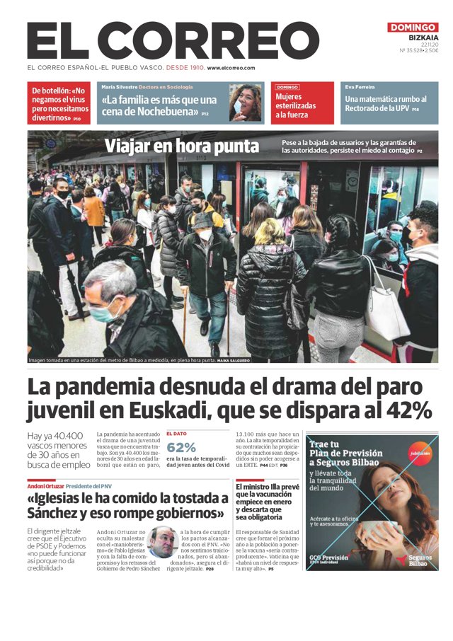 EL CORREO: "La pandemia desnuda el drama del paro juvenil en Euskadi, que se dispara al 42%"; "De botellón: No negamos el virus pero necesitamos divertirnos"; "María Silvestre: La familia es más que una cena de Nochebuena"; "Mujeres estirilizadas a la fuerza"; "Una matemática rumbo al rectorado de la UPV"; "Viajar en hora punta"; "Ortuzar: Iglesias le ha comido la tostada a Sánchez y eso rompe gobiernos"; "El ministro Illa prevé que la vacunación empiece en enero y descarta que sea obligatoria".