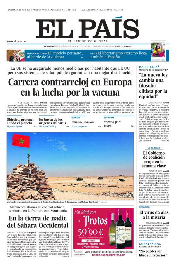 EL PAÍS: "Carrera contrarreloj en Europa en la lucha por la vacuna"; "El 'modelo peruano', al borde de la quiebra"; "El libertarismo extremo llega también a España"; "Isabel Celaá: "La nueva ley cambia una filosofía elitista por la equidad""; "En la tierra de nadie del Sáhara Occidental"; "El Gobierno de coalición cruje en la semana clave"; "El virus da alas a la miseria"; "Guy Standing: No puedes ser libre sin recursos".