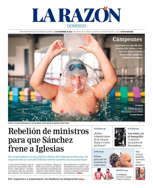LA RAZÓN: "Campeones. Cristian es uno de los cientos de niños a los que la 'Ley Celaá' dejará sin centros especiales"; "Rebelión de ministros para que Sánchez frene a Iglesias"; "¿Están robando datos de la vacuna Rusia y Corea del Norte?"; "Los nazis en el banquillo. 75 años de los juicios de Nuremberg"; "Robos para que los ancianos no estén solos"; "1-0 al Barça: El Atlético, lanzado y Piqué se lesiona"; "Del 'Aquarius' a Arguineguin: los bandazos en inmigración".