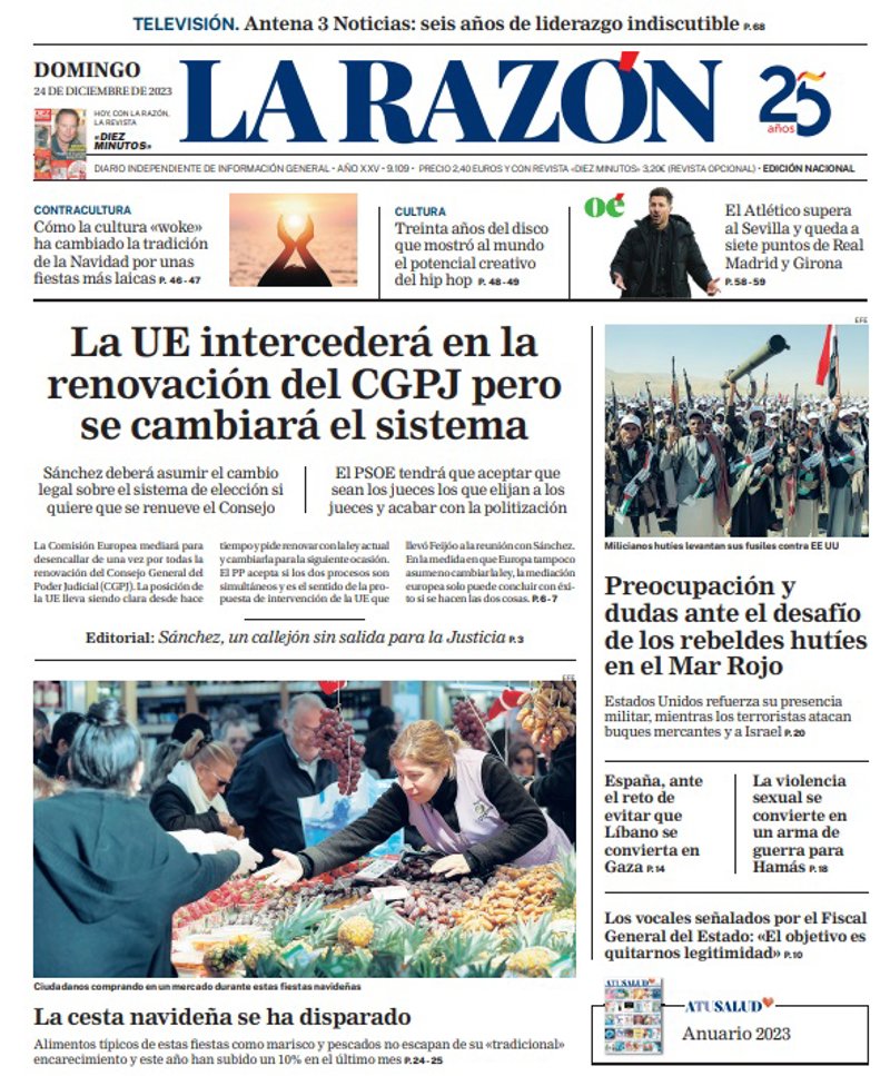 LA RAZÓN: "La UE intercederá en la renovación del CGPJ pero se cambiará el sistema"; "Preocupación y dudas ante el desafío de los rebeldes hutíes en el Mar Rojo"; "La cesta navideña se ha disparado"; "España, ante el reto de evitar que Líbano se convierta en Gaza"; "La violencia sexual se convierte en un arma de guerra para Hamás".