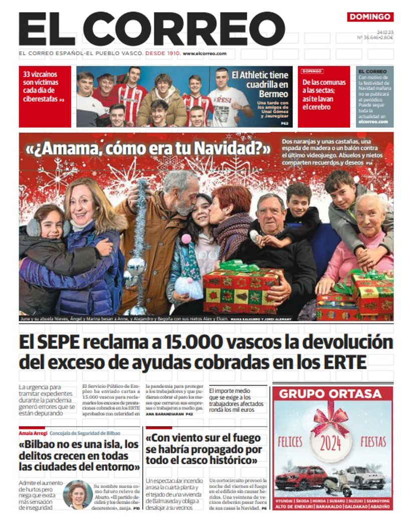 EL CORREO: "El SEPE reclama a 15.000 vascos la devolución del exceso de ayudas cobradas en los ERTE"; "Amaia Arregi, concejala de Seguridad en Bilbao: "Bilbao no es una isla, los delitos crecen en todas las ciudades del entorno"".