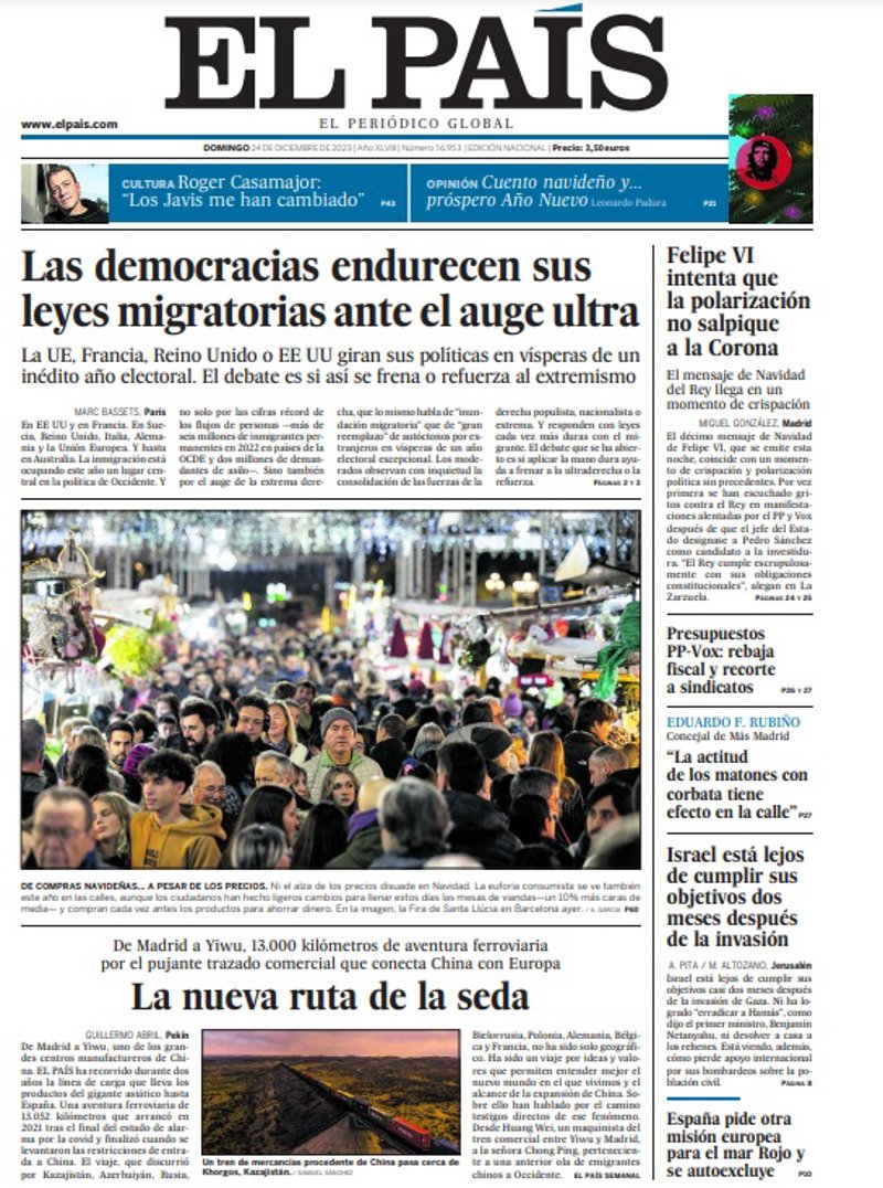 EL PAÍS: "Las democracias endurecen sus leyes migratorias ante el auge ultra"; "Felipe VI intenta que la polarización no salpique a la Corona"; "Presupuestos PP-Vox: rebaja fiscal y recorte a sindicatos"; "Eduardo F. Rubiño, concejal de Más Madrid: "La actitud de los matones con corbata tiene efecto en la calle""; "Israel está lejos de cumplir sus objetivos dos meses después de la invasión"; "España pide otra misión europea para el mar Rojo y se autoexcluye".