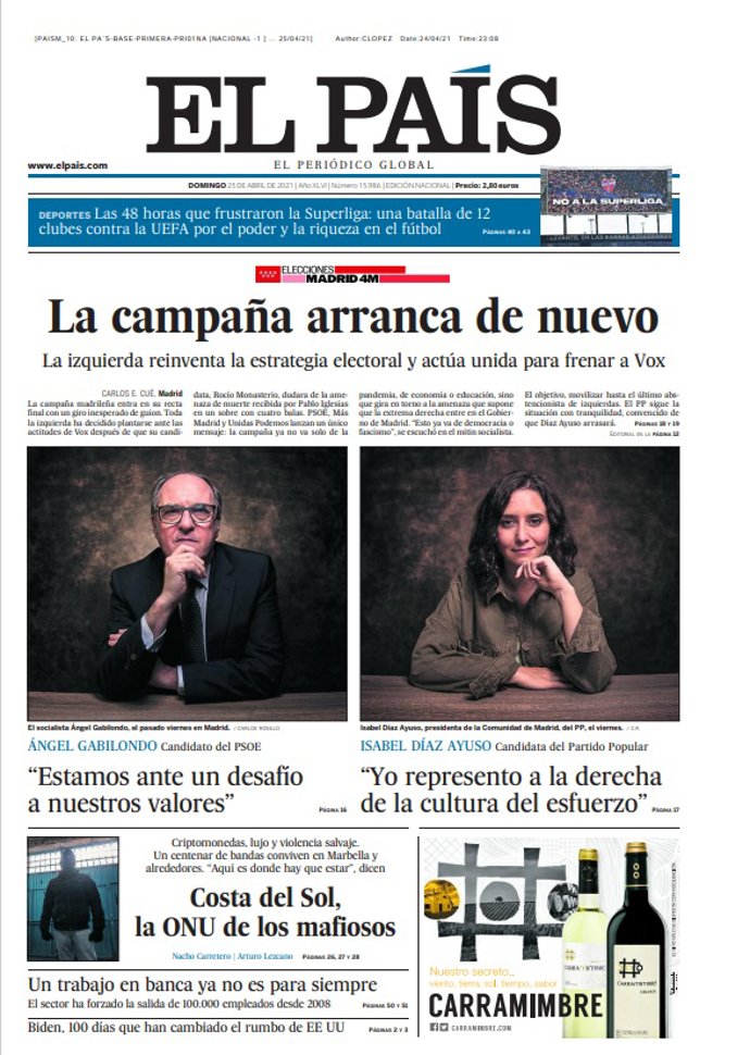 EL PAÍS: "La campaña arranca de nuevo"; "La izquierda reinventa la estrategia electoral y actúa unida para frenar a Vox"; "Ángel Gabilondo: 'Estamos ante un desafío a nuestros valores'; "Isabel Díaz Ayuso: 'Yo represento a la derecha de la cultura del esfuerzo"; "Costa del sol, la ONU de los famosos".