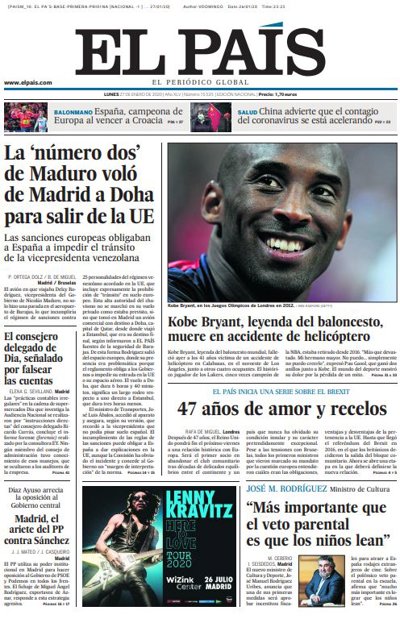EL MUNDO: "El caos en el Gobierno dispara las críticas del PSOE a Moncloa"; "Delgado se prepara para nombrar 50 cargos clave de la Fiscalía"; "El PNV exige negociar ya la transferencia de prisiones y las pensiones"; "Iván Espinosa de los Monteros: "El PP no es capaz de asumir ni digerir que Vox ha llegado para quedarse""; "Adiós a Kobe Bryant".