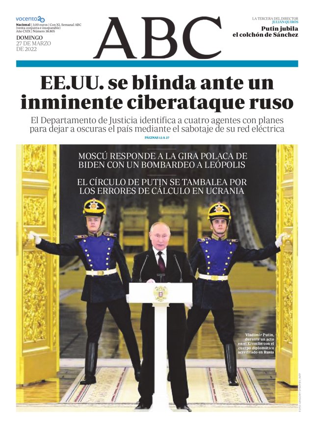 ABC: "EE.UU. se blinda ante un inminente ciberataque ruso"; "Moscú responde a la gira polaca de Biden con un bombardeo a Leópolis".