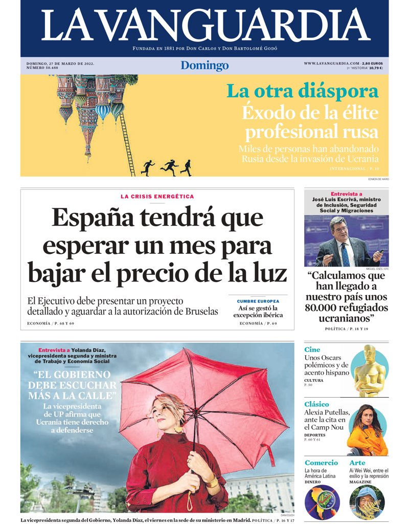 LA VANGUARDIA: "España tendrá que esperar un mes para bajar el precio de la luz"; "Yolanda Díaz: El Gobierno debe escuchar más a la calle"; "José Luis Escribá: Calculamos que han llegado a nuestro país unos 80.000 refugiados ucranianos"; "La otra diáspora: Éxodo de la élite profesional rusa".