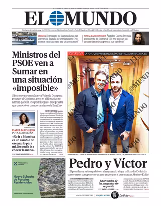 EL MUNDO: "Pedro y Víctor. El presidente se fotografió con el empresario al que la Guardia Civil sitúa como 'nexo corruptor' en un acto en 2019 en el que estaban Ábalos y Koldo"; "Ministros del PSOE ven a Sumar en una situación 'imposible'. Sánchez va a respaldar a Yolanda Díaz para proteger el Gobierno, pero en el Ejecutivo se admite que ella no podrá seguir si se prueba que conoció el comportamiento de Errejón". Isabel Díaz Ayuso: "No ir a Moncloa es un cambio de escenario para mí. No podía ir a chocar la mano".