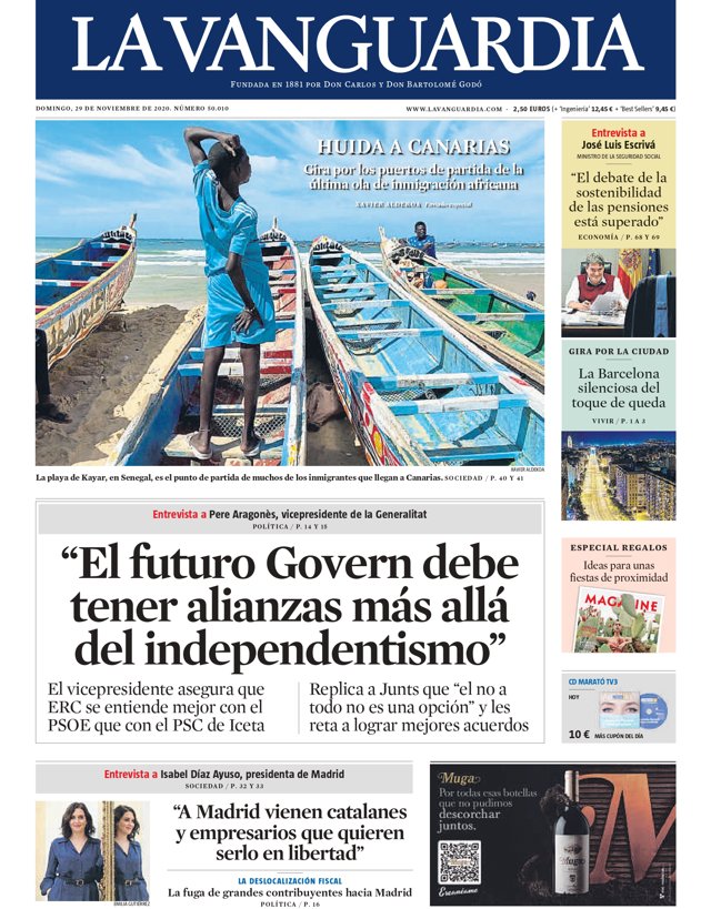 LA VANGUARDIA: "Huida a Canarias. Gira por los puertos de partida de la última ola de inmigración africana"; "Entrevista a José Luis Escrivá: "El debate de la sostenibilidad de las pensiones está superado""; "La Barcelona silenciosa del toque de queda"; "Pere Aragonès: "El futuro Govern debe tener alianzas más allá del independentismo""; "Isabel Díaz Ayuso: "A Madrid vienen catalanes y empresarios que quieren serlo en libertad"".