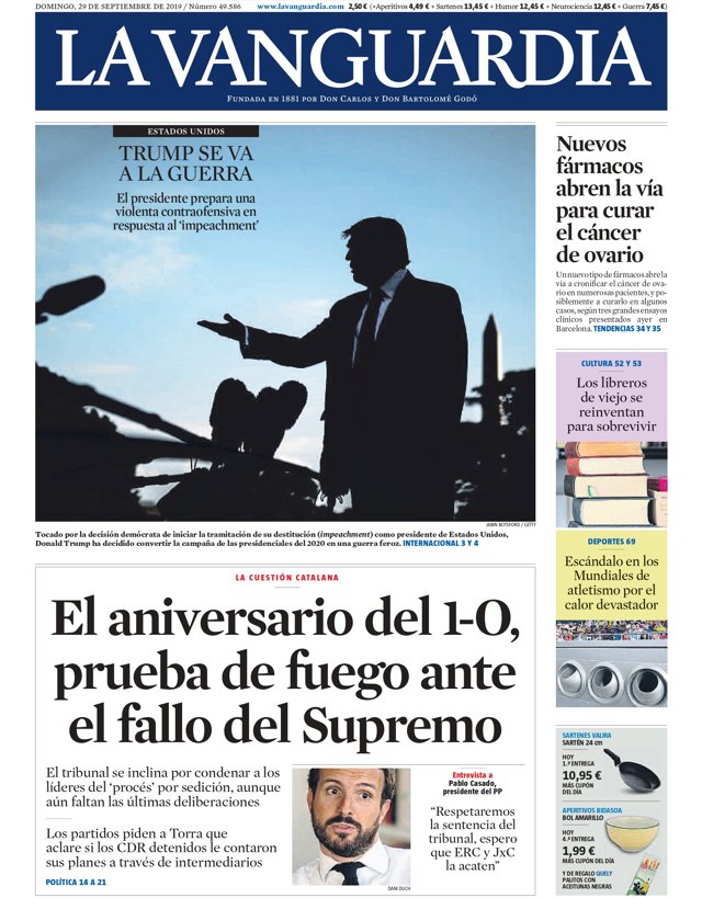 LA VANGUARDIA: 'La cuestión catalana': "El aniversario del 1-O, prueba de fuego ante el fallo del Supremo"; "El tribunal se inclina por condenar a los líderes del 'procés' por sedición, aunque aún faltan las últimas deliberaciones"; "Los partidos piden a Torra que aclare si los CDR detenidos le contaron sus planes a través de intermediarios".