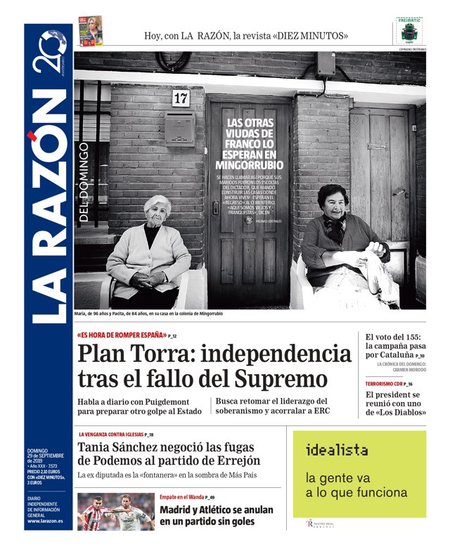 LA RAZÓN: 'Es hora de romper España': "Plan Torra: independencia tras el fallo del Supremo", "habla a diario con Puigdemont para preparar otro golpe al Estado", "busca retomar el liderazgo del soberanismo y acorralar a ERC"; 'La venganza contra Iglesias': "Tania Sánchez negoció las fugas de Podemos al partido de Errejón", "la exdiputada es la 'fontanera' en la sombra de Más País".