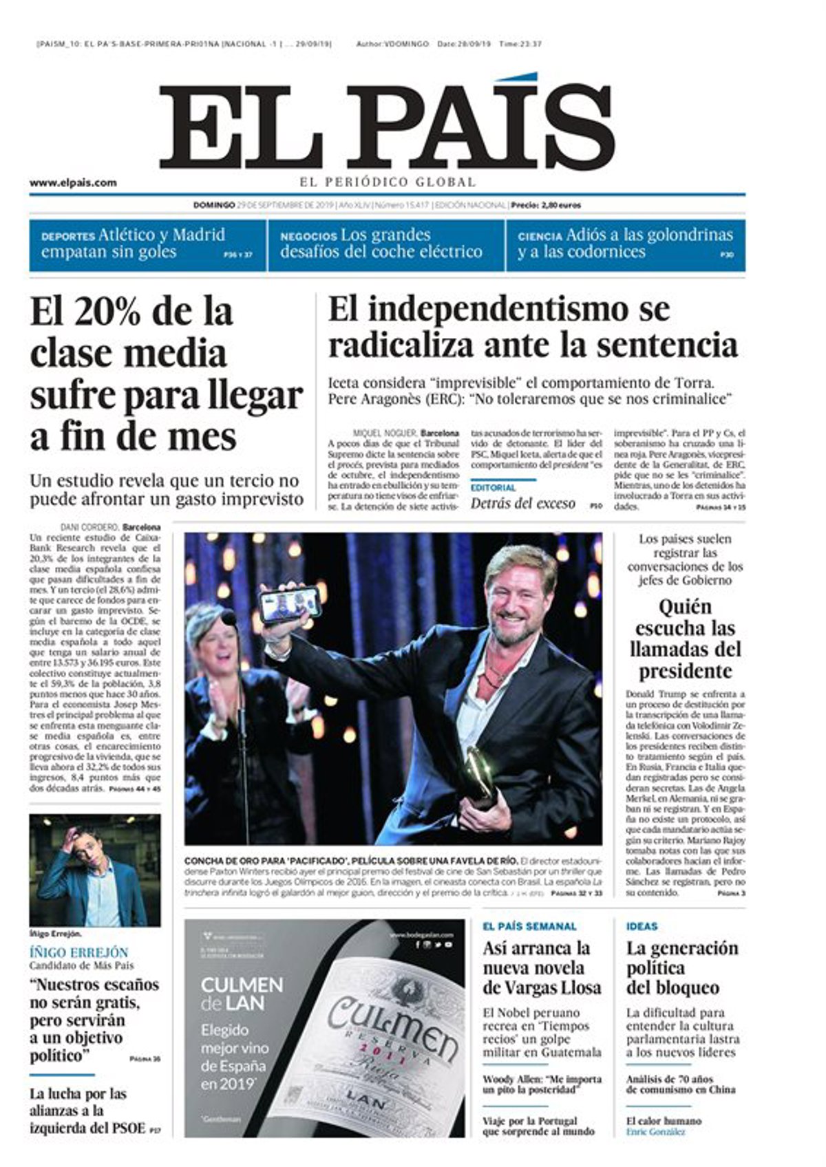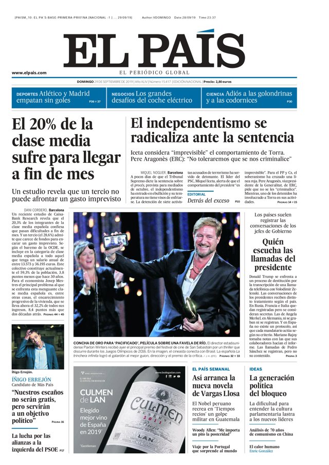 EL PAÍS: "El 20% de la clase media sufre para llegar a fin de mes", "un estudio revela que un tercio no puede afrontar un gasto imprevistos"; "El independentismo se radicaliza ante la sentencia", "Iceta considera 'imprevisible' el comportamiento de Torra, Pere Aragonès (ERC): "No toleraremos que se nos criminalice".