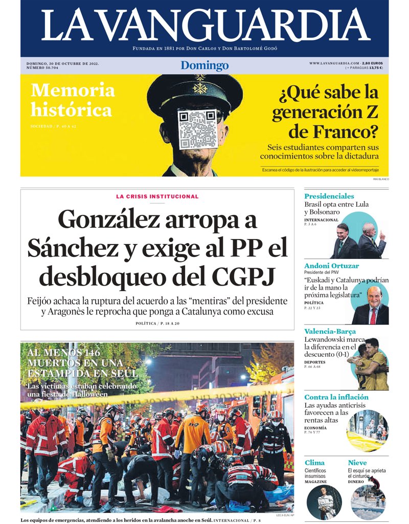 LA VANGUARDIA: "González arropa a Sánchez y exige al PP el desbloqueo del CGPJ"; "Al menos 146 muertos en una estampida en Seúl"; "¿Qué sabe la generación Z de Franco?".