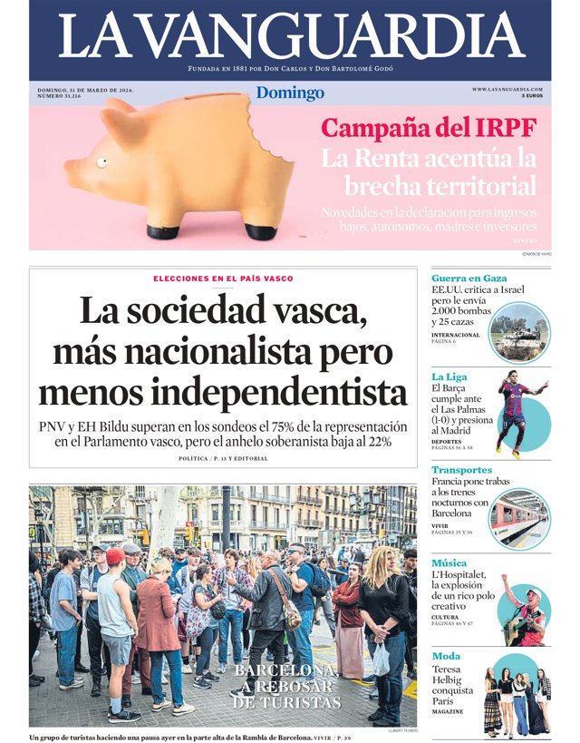 LA VANGUARDIA: "La sociedad vasca, más nacionalista pero menos independentista"; "Barcelona, a rebosar de turistas"; "EE.UU. critica a Israel pero le envía 2.000 bombas y 25 cazas".