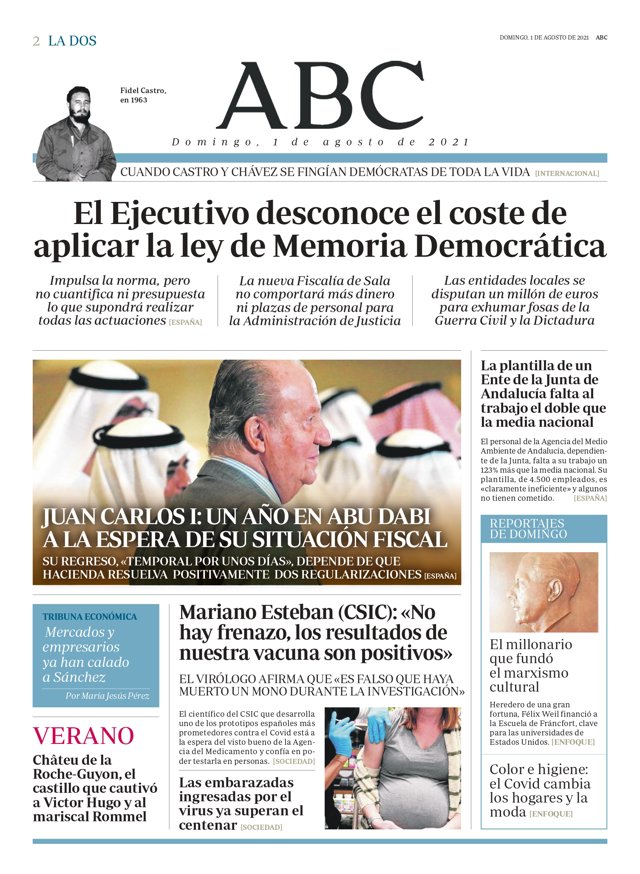 ABC: "El Ejecutivo desconoce el coste de aplicar la ley de Memoria Democrática"; "La plantilla de un Ente de la Junta de Andalucía falta al trabajo el doble que la media nacional"; "Juan Carlos I: un año en Abu Dabi a la espera de su situación fiscal"; "Mariano Esteban (CSIC): 'No hay frenazo, los resultados de nuestra vacuna son positivos'"; "Mercados y empresarios ya han calado a Sánchez"; "Château de la Roche-Guyon, el castillo que cautivó a Victor Hugo y al mariscal Rommel"; "Las embarazadas ingresadas por el virus ya superan el centenar"; "El millonario que fundó el marxismo cultural"; "Color e higiene: el Covid cambia los hogares y la moda".