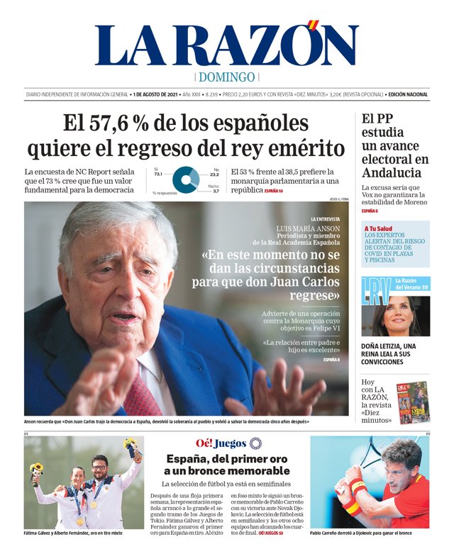 LA RAZÓN: "El 57,6% de los españoles quiere el regreso del rey emérito"; "EL PP estudia un avance electoral en Andalucía"; "Los expertos alertan del riesgo de contagio de covid en las playas y piscinas"; "Doña Letizia, una reina leal a sus convicciones"; "España, del primer oro a un bronce memorable".