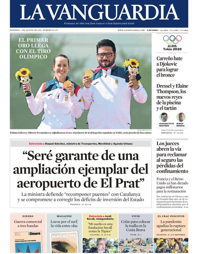 LA VANGUARDIA: "El primer oro llega con el tiro olímpico"; "Carreño bate a Djokovic para lograr el bronce"; "Dressel y Elaine Thompson, los nuevos reyes de la piscina y el tartán"; "Los jueces abren la vía para reclamar al seguro las pérdidas del confinamiento"; "Seré garante de una ampliación ejemplar del aeropuerto de El Prat".